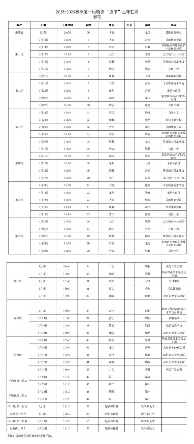 本届顺德“德甲”以十镇街为参赛主体,采用大循环积分结合淘汰制,由冠军赛和挑战赛两大核心赛事组成,将于2026年3月至6月开启53场比赛。
