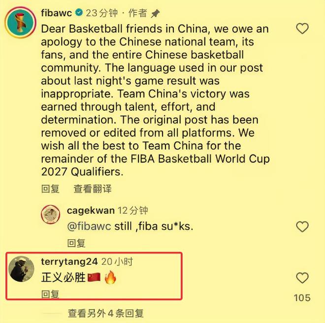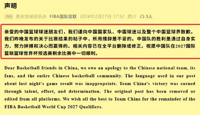 FIBA不再说中国男篮赢得不光彩了,而是改口说对不起!承认中国男篮绝对是凭实力赢得比赛,而不是什么“偷走了胜利”。